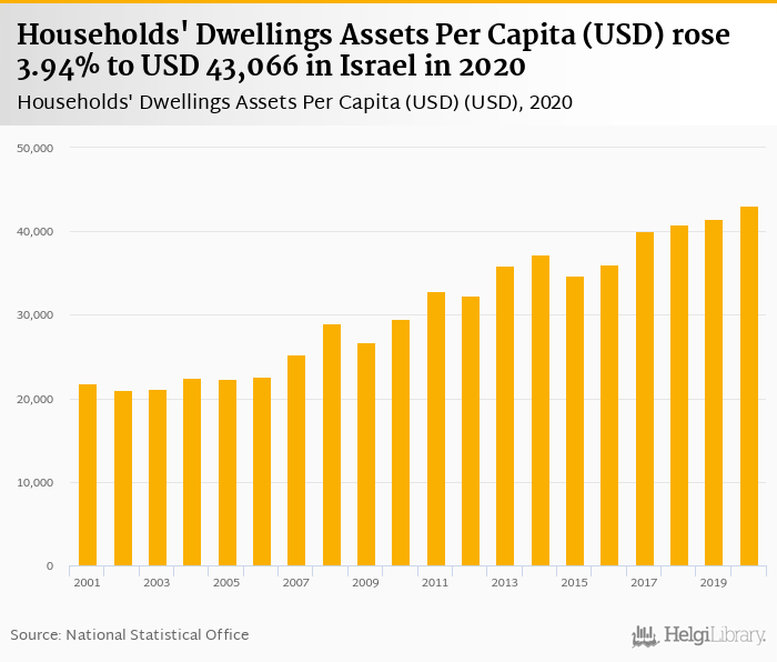 Households' dwellings assets per capita rose 3.94% to USD 43,066 in Israel in 2020, according to OECD.