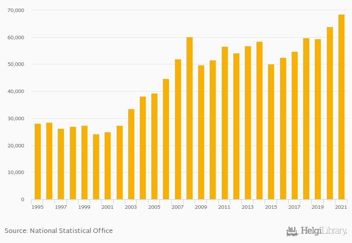 Historically, households' dwellings assets per capita in Denmark reached an all time high of USD 68,577 in 2021 and an all time low of USD 24,203 in 2000.