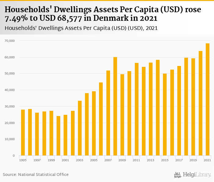 Households' dwellings assets per capita rose 7.49% to USD 68,577 in Denmark in 2021, according to OECD.