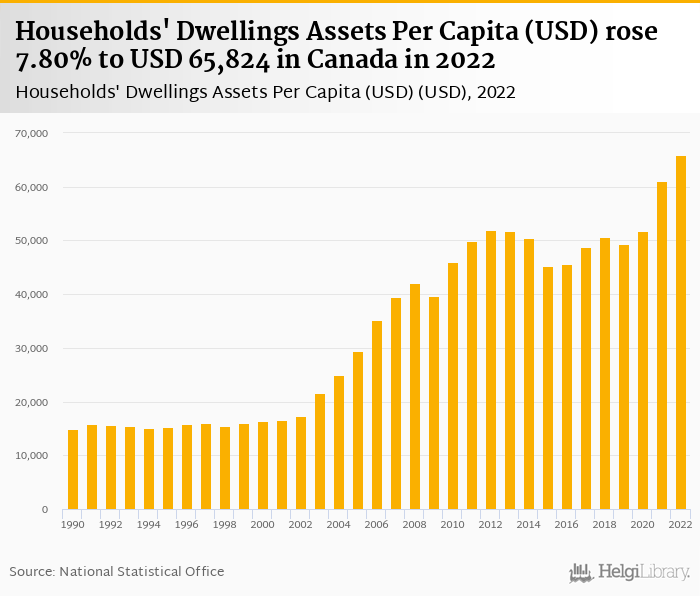 Historically, households' dwellings assets per capita in Canada reached an all time high of USD 65,824 in 2022 and an all time low of USD 14,802 in 1990.