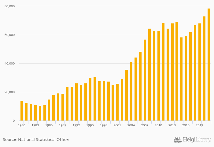 Historically, households' dwellings assets per capita in France reached an all time high of USD 78,597 in 2021 and an all time low of USD 10,487 in 1984.