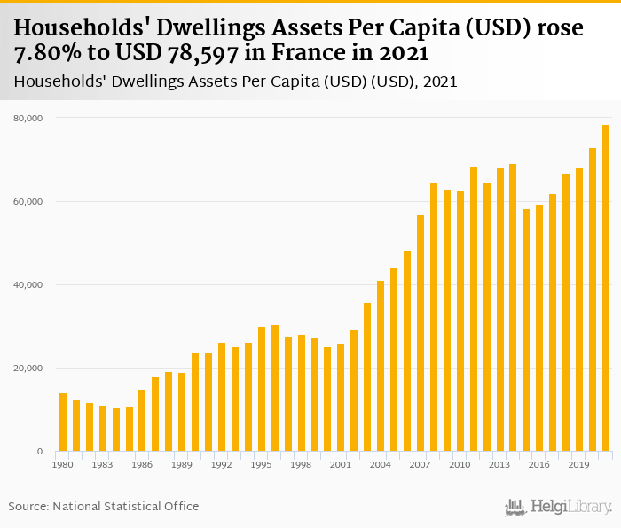 Households' dwellings assets per capita rose 7.80% to USD 78,597 in France in 2021, according to OECD.