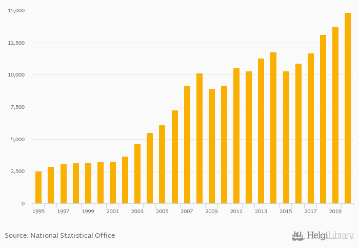 Historically, households' dwellings assets per capita in Lithuania reached an all time high of USD 14,821 in 2020 and an all time low of USD 2,526 in 1995.