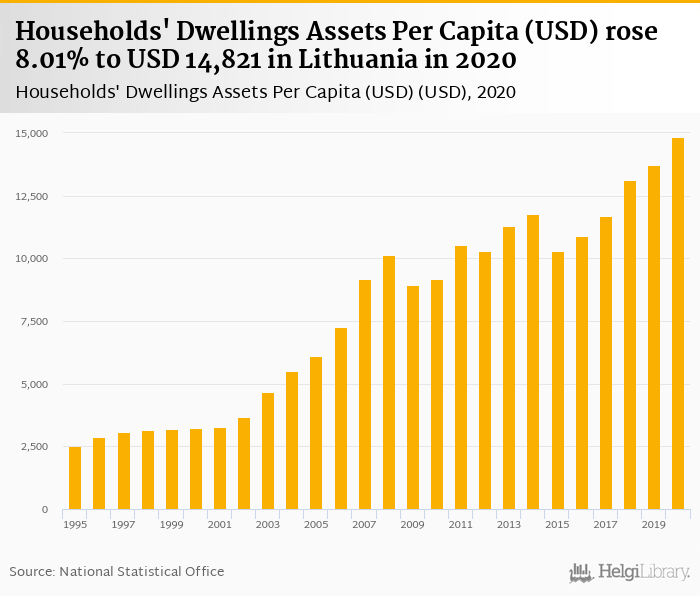 Households' dwellings assets per capita rose 8.01% to USD 14,821 in Lithuania in 2020, according to OECD.