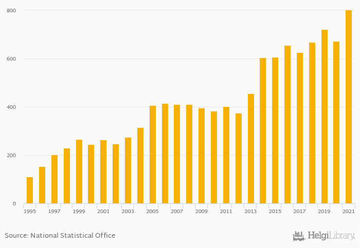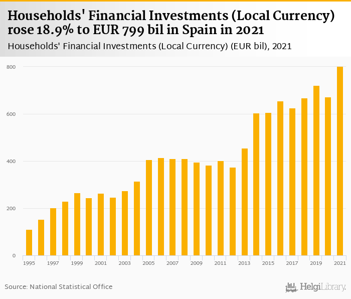 Historically, households' financial investments in Spain reached an all time high of EUR 799 bil in 2021 and an all time low of EUR 110 bil in 1995.