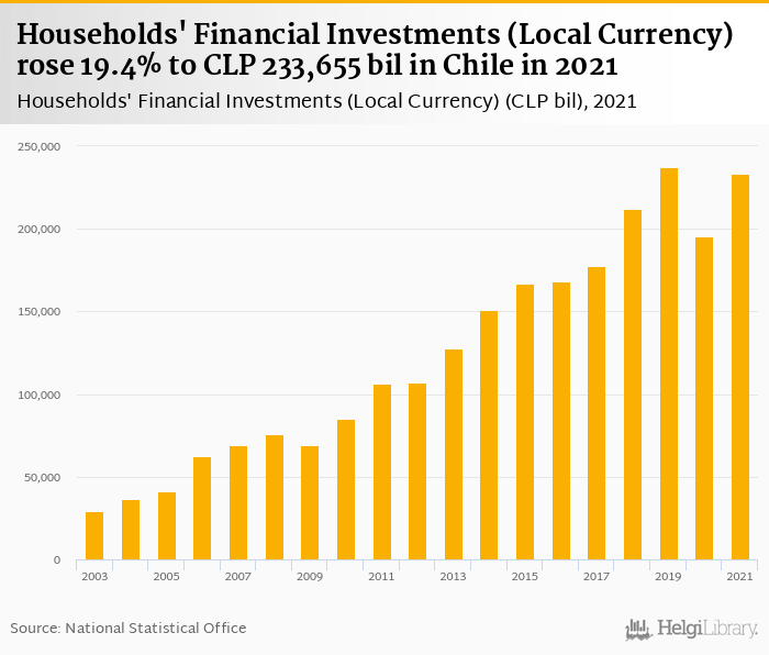 Households' financial investments rose 19.4% to CLP 233,655 bil in Chile in 2021, according to OECD.