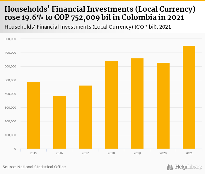 Households' financial investments rose 19.6% to COP 752,009 bil in Colombia in 2021, according to OECD.