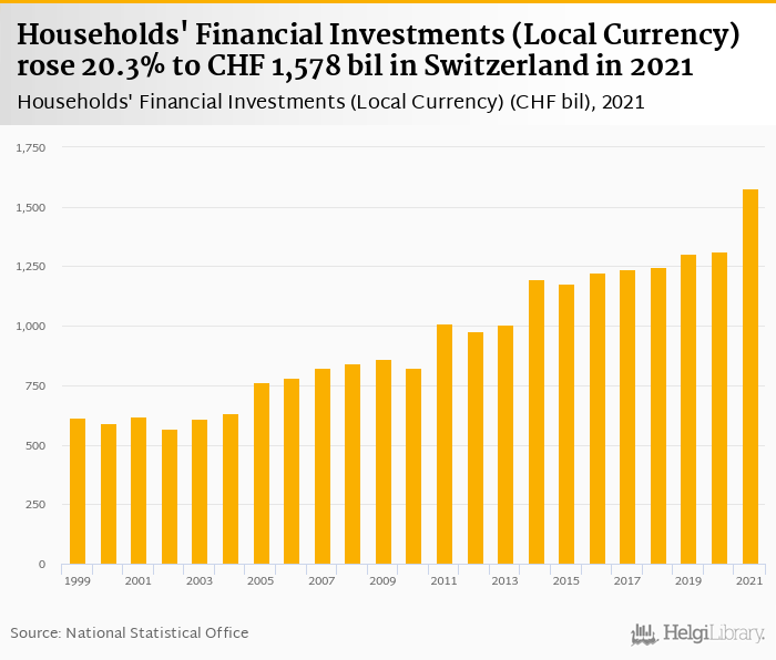 Historically, households' financial investments in Switzerland reached an all time high of CHF 1,578 bil in 2021 and an all time low of CHF 569 bil in 2002.