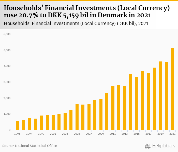 Households' financial investments rose 20.7% to DKK 5,159 bil in Denmark in 2021, according to OECD.