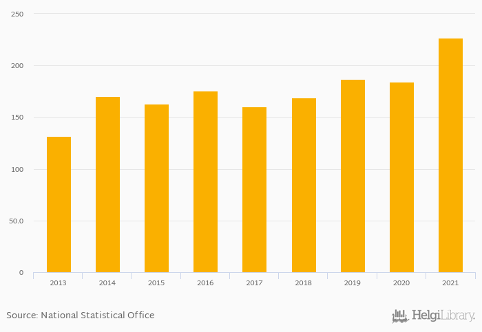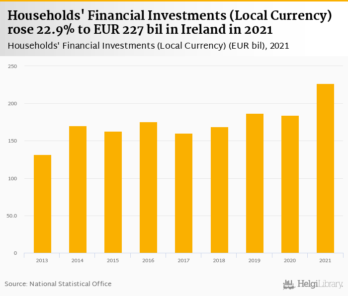 Historically, households' financial investments in Ireland reached an all time high of EUR 227 bil in 2021 and an all time low of EUR 131 bil in 2013.