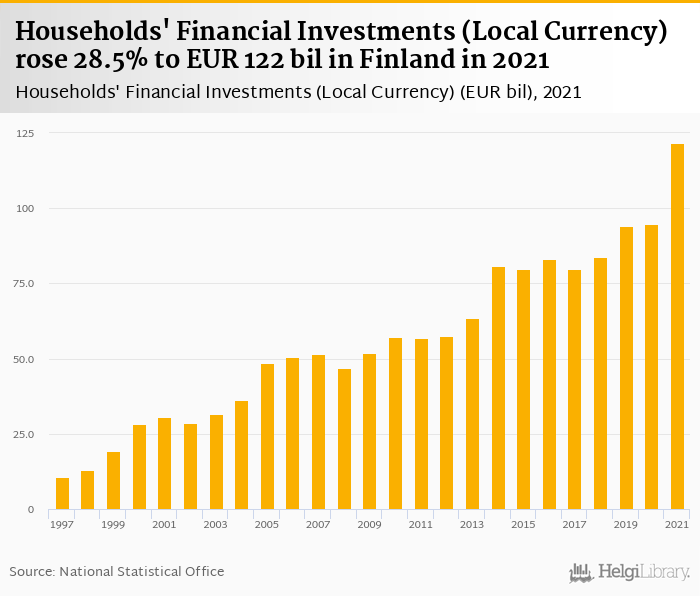 Historically, households' financial investments in Finland reached an all time high of EUR 122 bil in 2021 and an all time low of EUR 10.6 bil in 1997.