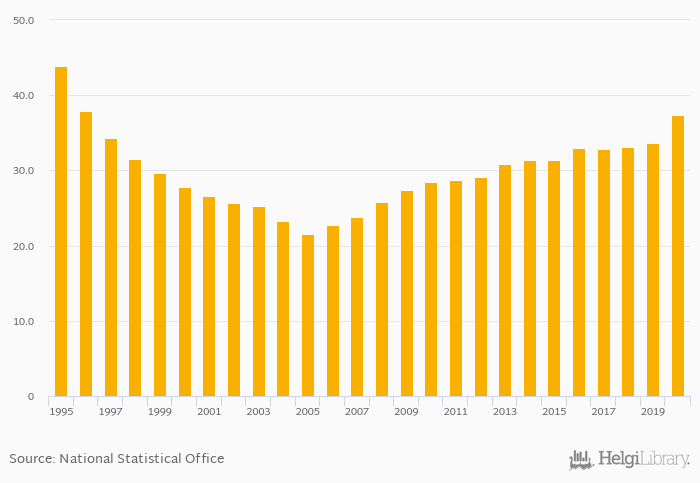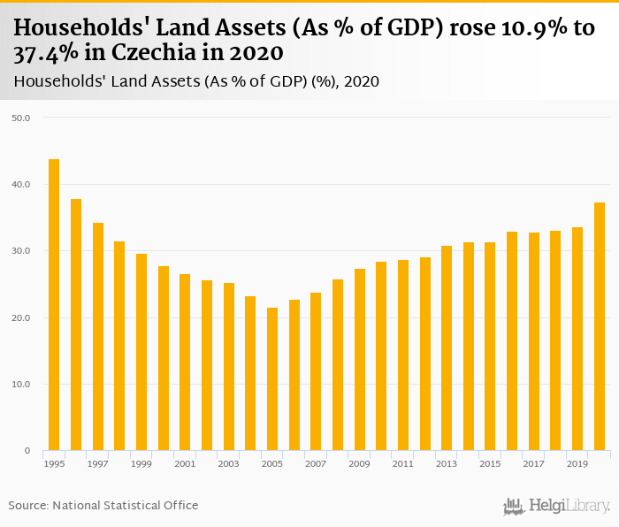 Households' land assets as of GDP rose 10.9% to 37.4% in Czechia in 2020, according to OECD.