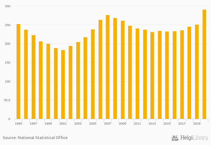 Households' land assets as of GDP rose 16.0% to 291% in South Korea in 2020, according to OECD.
