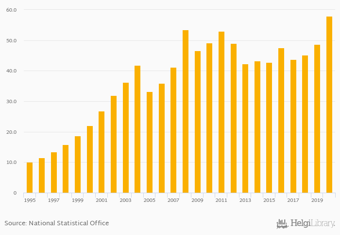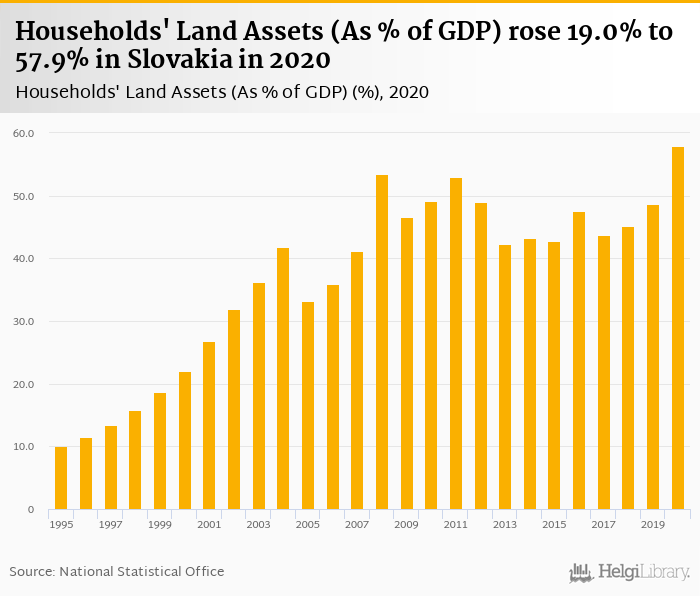 Households' land assets as of GDP rose 19.0% to 57.9% in Slovakia in 2020, according to OECD.