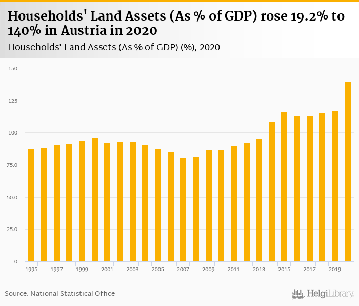 Households' land assets as of GDP rose 19.2% to 140% in Austria in 2020, according to OECD.