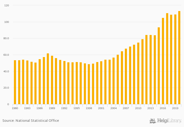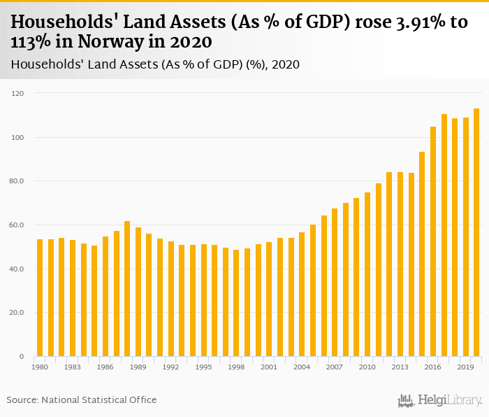 Households' land assets as of GDP rose 3.91% to 113% in Norway in 2020, according to OECD.