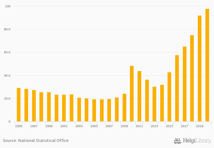 Historically, households' land assets as of GDP in Hungary reached an all time high of 97.8% in 2020 and an all time low of 19.4% in 2006.