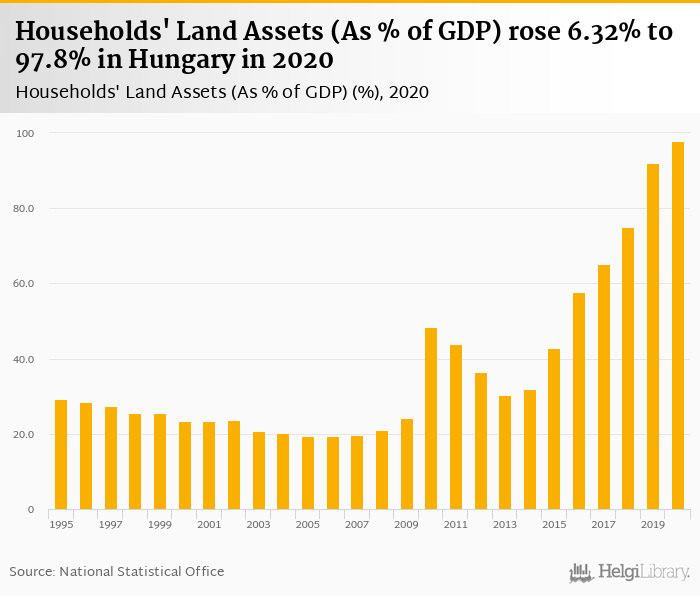 Households' land assets as of GDP rose 6.32% to 97.8% in Hungary in 2020, according to OECD.