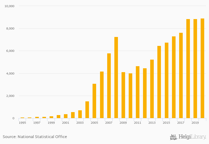 Historically, households' land assets per capita in Lithuania reached an all time high of USD 8,905 in 2020 and an all time low of USD 76.0 in 1995.