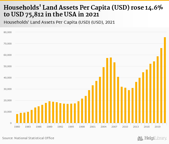 Historically, households' land assets per capita in the USA reached an all time high of USD 75,812 in 2021 and an all time low of USD 8,127 in 1980.