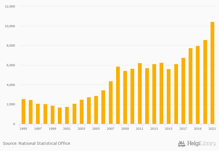 Historically, households' land assets per capita in Czechia reached an all time high of USD 10,450 in 2021 and an all time low of USD 1,679 in 2000.