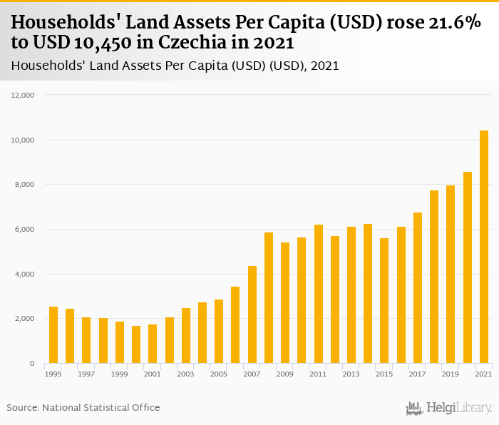 Households' land assets per capita rose 21.6% to USD 10,450 in Czechia in 2021, according to OECD.