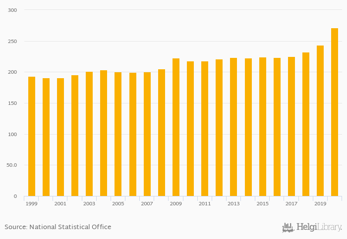 Historically, households' non-financial assets as of GDP in Germany reached an all time high of 271% in 2020 and an all time low of 191% in 2001.