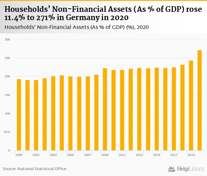 Households' non-financial assets as of GDP rose 11.4% to 271% in Germany in 2020, according to OECD.