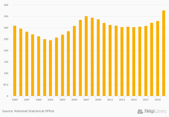 Historically, households' non-financial assets as of GDP in South Korea reached an all time high of 377% in 2020 and an all time low of 245% in 2001.