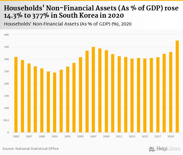Households' non-financial assets as of GDP rose 14.3% to 377% in South Korea in 2020, according to OECD.