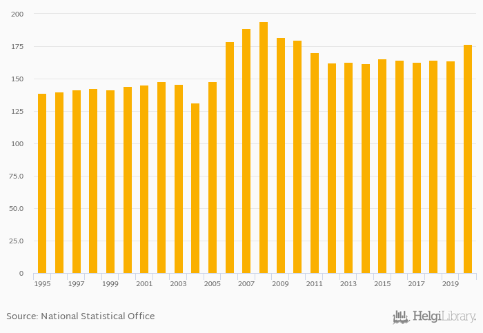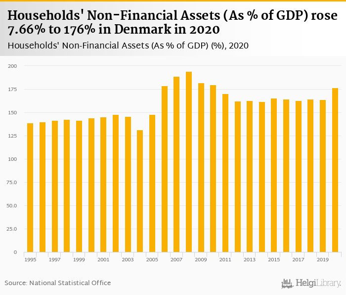 Households' non-financial assets as of GDP rose 7.66% to 176% in Denmark in 2020, according to OECD.