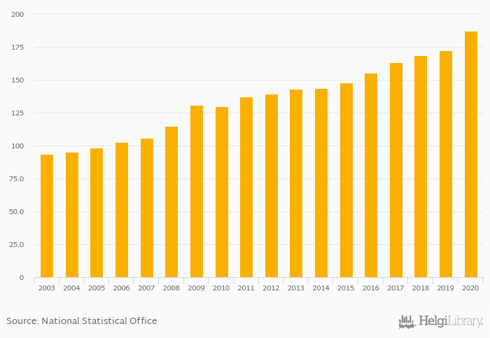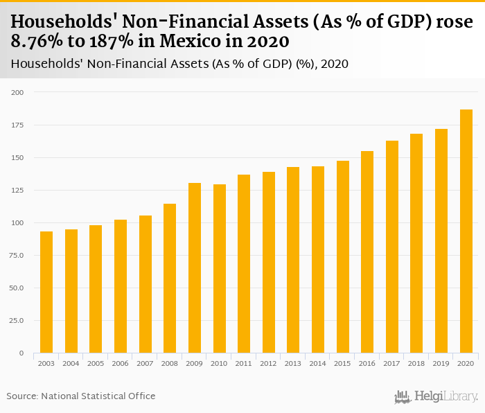 Households' non-financial assets as of GDP rose 8.76% to 187% in Mexico in 2020, according to OECD.