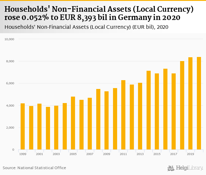 Households' non-financial assets rose 0.052% to EUR 8,393 bil in Germany in 2020, according to OECD.