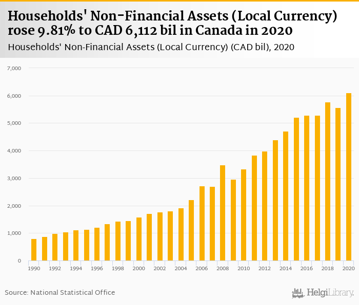 Households' non-financial assets rose 9.81% to CAD 6,112 bil in Canada in 2020, according to OECD.