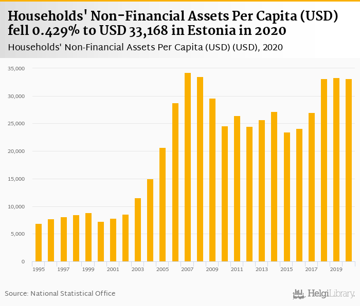 Households' non-financial assets per capita fell 0.429% to USD 33,168 in Estonia in 2020, according to OECD.