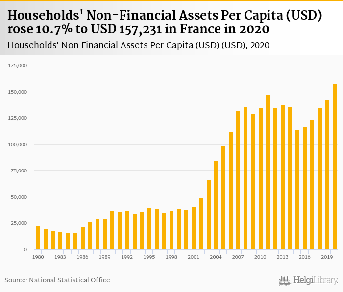 Households' non-financial assets per capita rose 10.7% to USD 157,231 in France in 2020, according to OECD.