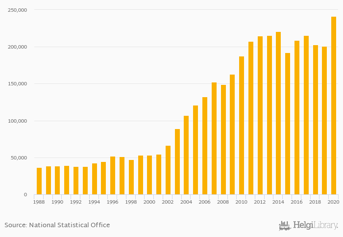 Historically, households' non-financial assets per capita in Australia reached an all time high of USD 241,682 in 2020 and an all time low of USD 36,355 in 1988.