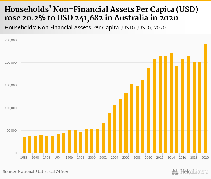 Households' non-financial assets per capita rose 20.2% to USD 241,682 in Australia in 2020, according to OECD.