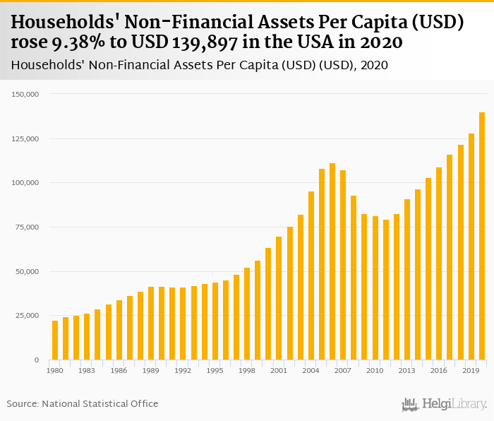 Households' non-financial assets per capita rose 9.38% to USD 139,897 in the USA in 2020, according to OECD.