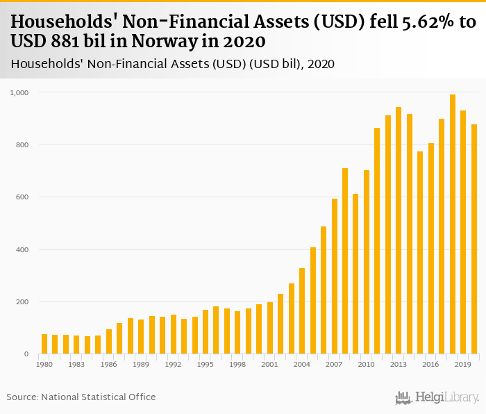 Households' non-financial assets fell 5.62% to USD 881 bil in Norway in 2020, according to OECD.