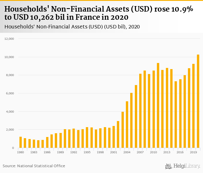 Households' non-financial assets rose 10.9% to USD 10,262 bil in France in 2020, according to OECD.