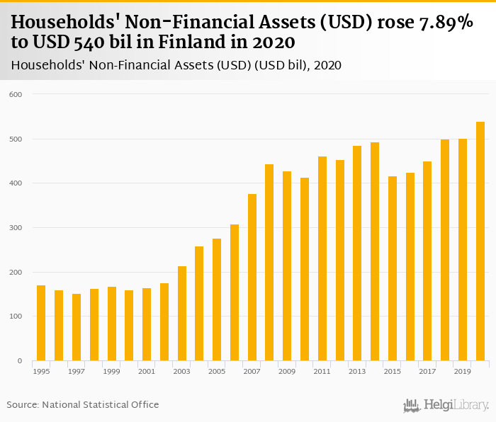 Households' non-financial assets rose 7.89% to USD 540 bil in Finland in 2020, according to OECD.