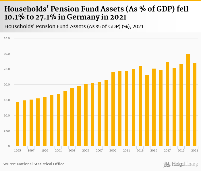 Households' pension fund assets as of GDP fell 10.1% to 27.1% in Germany in 2021, according to OECD.