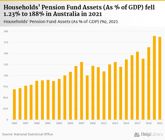 Households' pension fund assets as of GDP fell 1.23% to 188% in Australia in 2021, according to OECD.