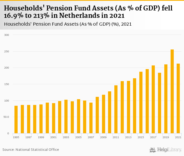 Households' pension fund assets as of GDP fell 16.9% to 213% in Netherlands in 2021, according to OECD.