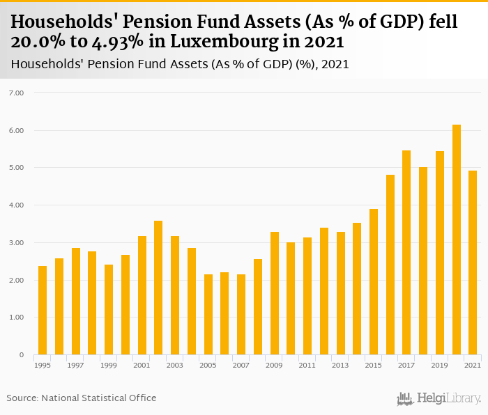 Households' pension fund assets as of GDP fell 20.0% to 4.93% in Luxembourg in 2021, according to OECD.
