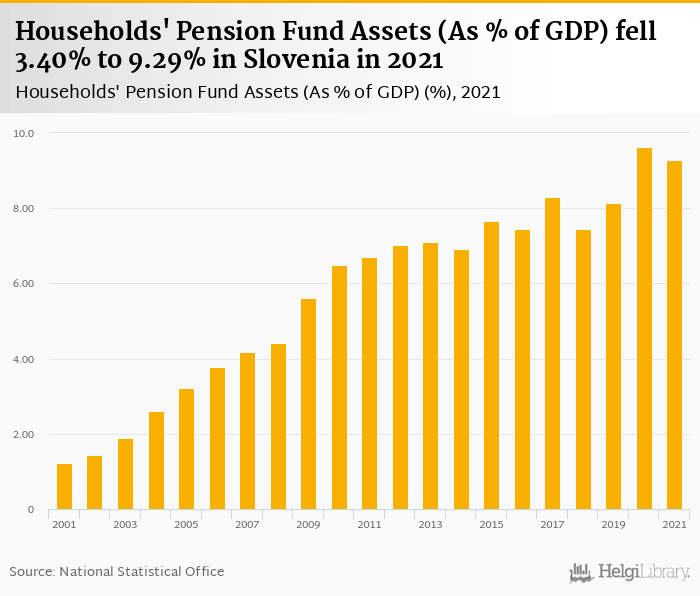 Households' pension fund assets as of GDP fell 3.40% to 9.29% in Slovenia in 2021, according to OECD.