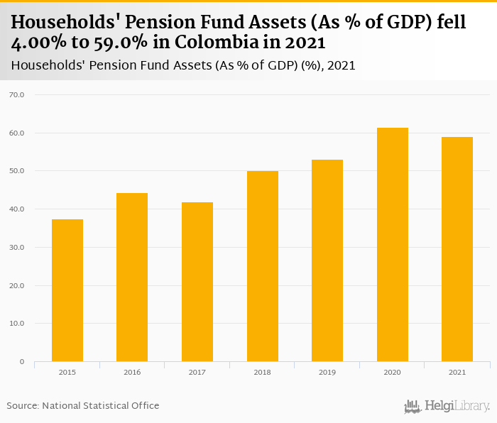 Households' pension fund assets as of GDP fell 4.00% to 59.0% in Colombia in 2021, according to OECD.