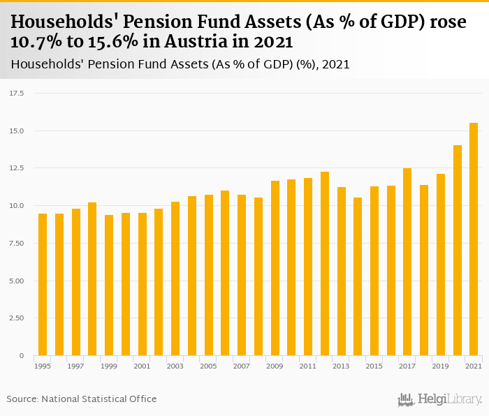 Households' pension fund assets as of GDP rose 10.7% to 15.6% in Austria in 2021, according to OECD.