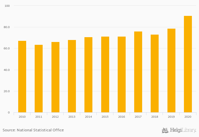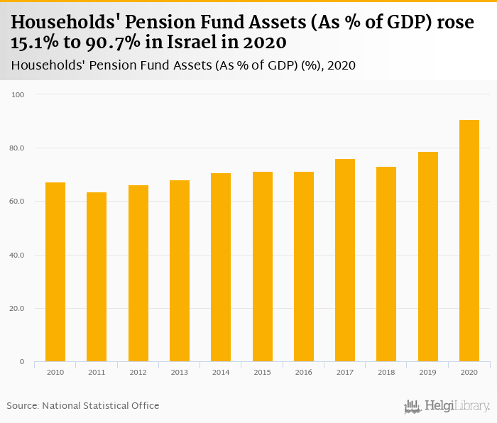 Historically, households' pension fund assets as of GDP in Israel reached an all time high of 90.7% in 2020 and an all time low of 63.7% in 2011.